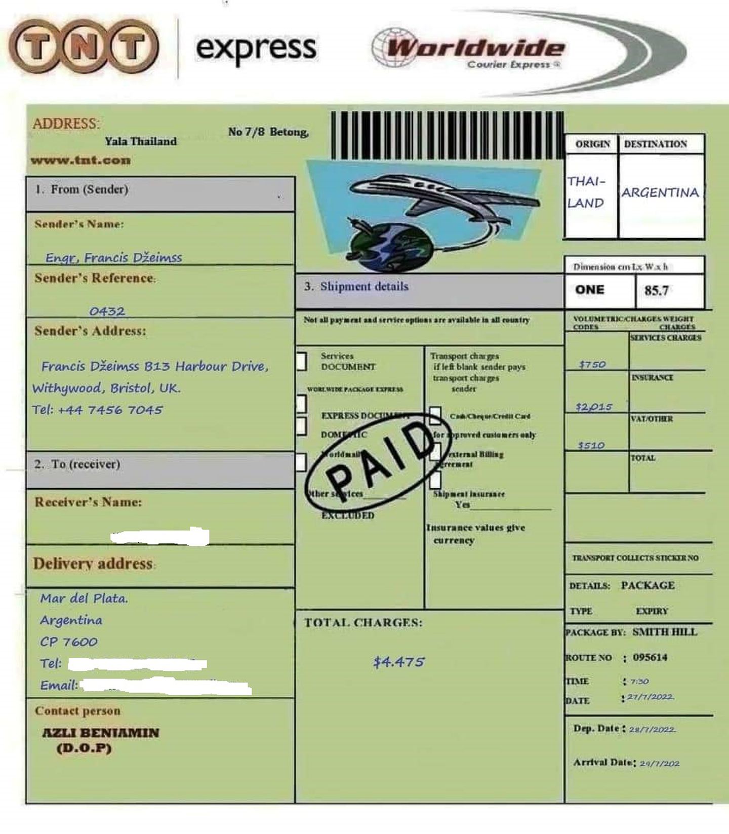 Con la excusa de destrabar el envío, el estafador comenzó a pedirle dinero a Leticia. En total, según consta en la denuncia, fueron tres transferencias por un valor de $1.125.000. Luego de cada operación, el acusado le mandaba comprobantes y un número de seguimiento del envío: todo era trucho.