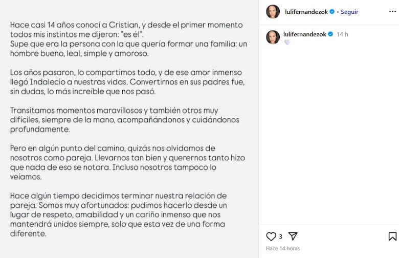 Luli Fernández anunció su separación de Cristian Cúneo Libarona tras 14 años de relación. En un extenso comunicado en sus redes sociales, la modelo dio las razones del fin de la unión sentimental. Casados desde el año 2014 y con un hijo llamado Indalecio, la pareja decidió tomar caminos distintos y sorprendieron al mundo del espectáculo.