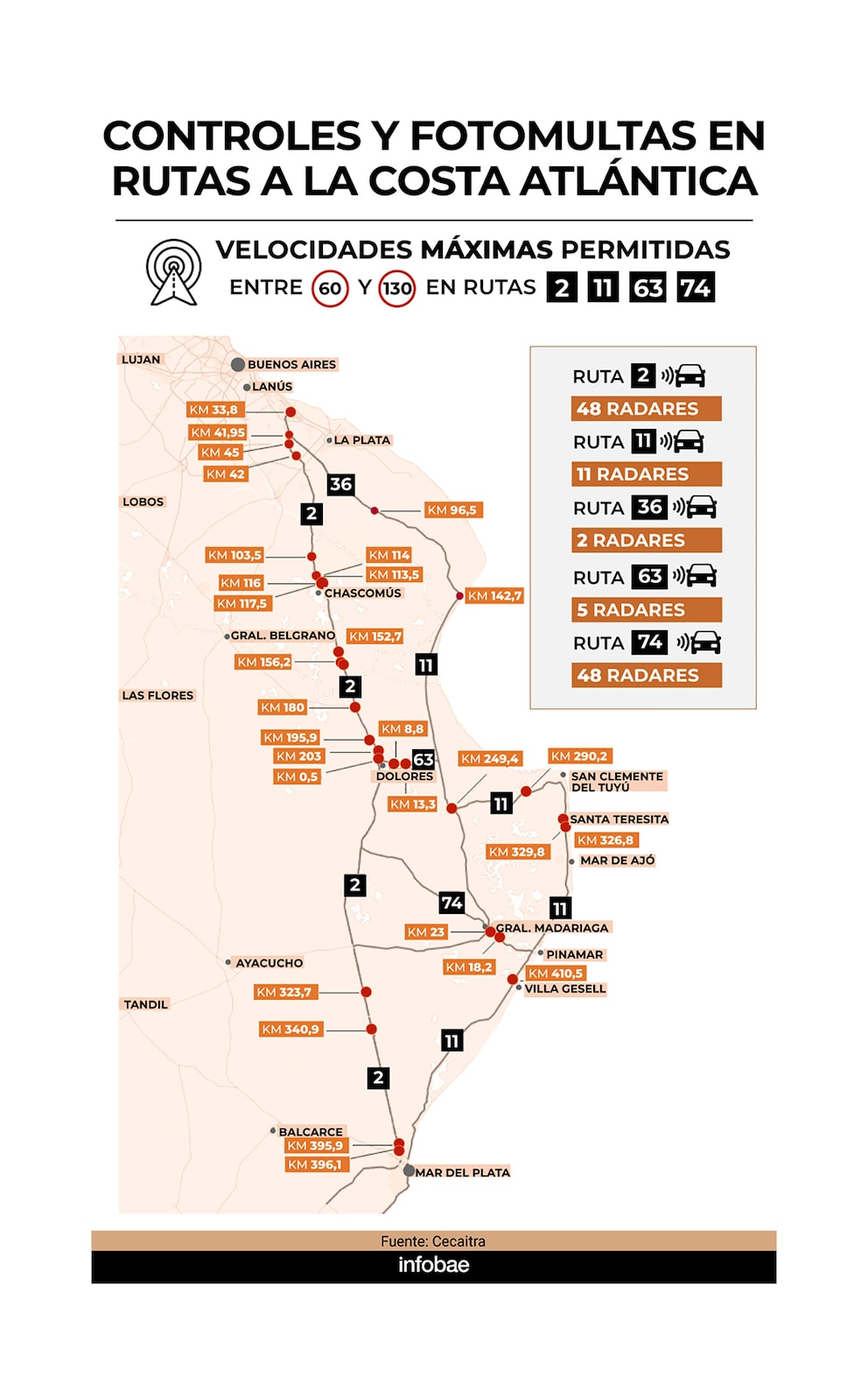 Las velocidades máximas en estos corredores varían entre 60 y 130 km/h. Hay instalados 48 radares en la ruta 2, 11 en la ruta 11, 2 en la ruta 36, 5 en la ruta 63 y 6 en la ruta 74.