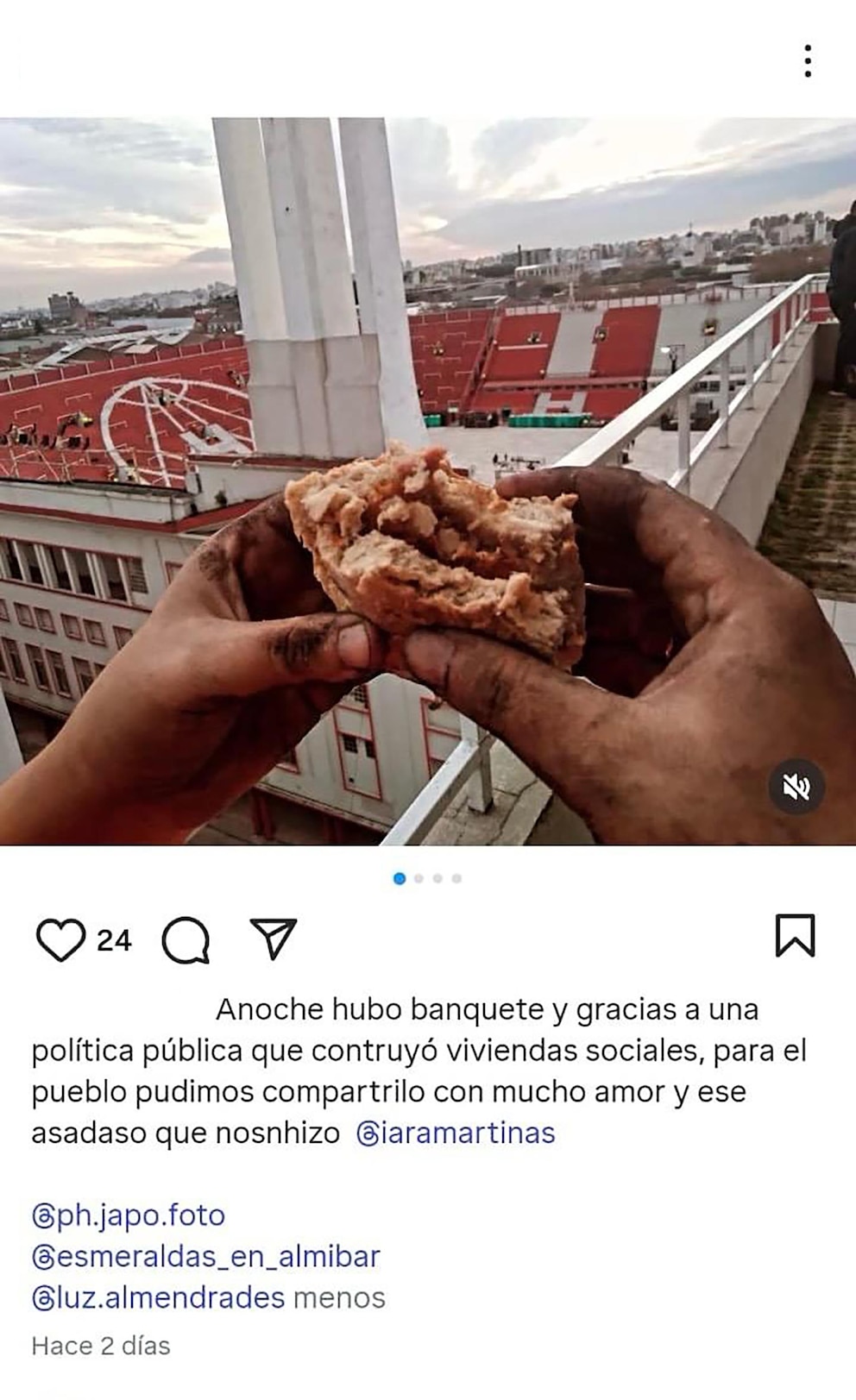 La mujer estaba convencida de que ella era más merecedora del Procrear que Mariela y así lo dejó entrever en varias de sus publicaciones en Instagram. “Anoche hubo banquete y gracias a una política pública que construyó viviendas sociales para el pueblo pudimos compartirlo con mucho amor”, escribió mientras comía un choripán en el balcón del departamento.